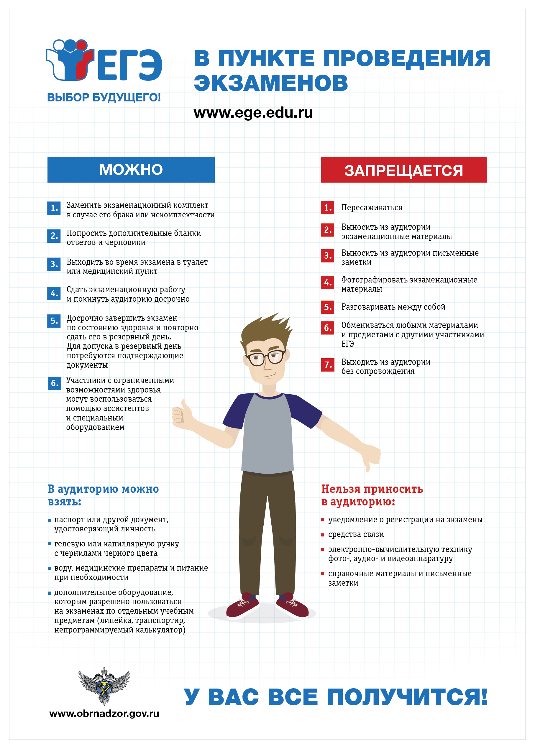 Информируем вас, что на сайте Федеральной службы по надзору в сфере образования и науки (Рособнадзор) в разделе «Пресс-служба. Информационные материалы» размещены информационные плакаты для участников единого государственного экзамена. Из них выпускники могут получить полезную информацию о порядке проведения ЕГЭ, что можно и нельзя делать на экзаменах, особенностях сдаваемых предметов, порядке подачи апелляций, нововведениях 2022 года.